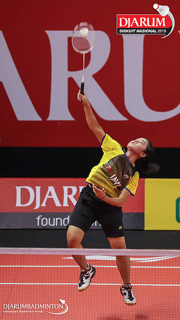 Asty Dwi Widyaningrum (Jaya Raya Jakarta) bersiap mengembalikan shuttlecock