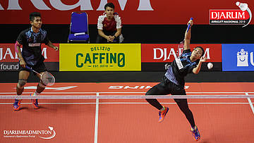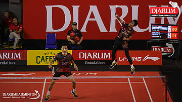 Kenas Adi Haryanto+Rian Agung Saputro (Berkat Abadi, Banjar) menyambar shuttlecock