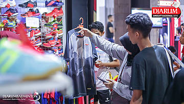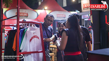 Dua orang pengunjung saat memilih merchandise di booth djarum
