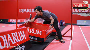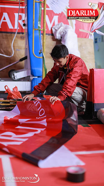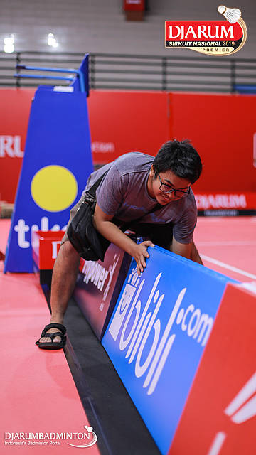 Salah satu pekerja sedang mengerjakan perlengkapan logistik Djarum Sirkuit Nasional Premier DKI Jakarta Open 2019
