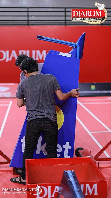 Dua orang pekerja sedang mengerjakan perlengkapan logistik Djarum Sirkuit Nasional Premier DKI Jakarta Open 2019