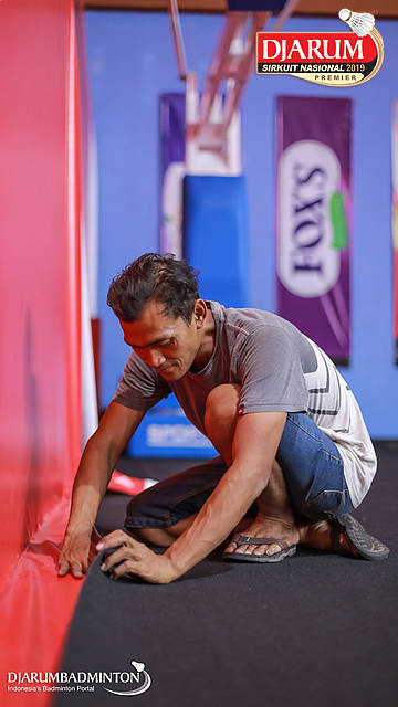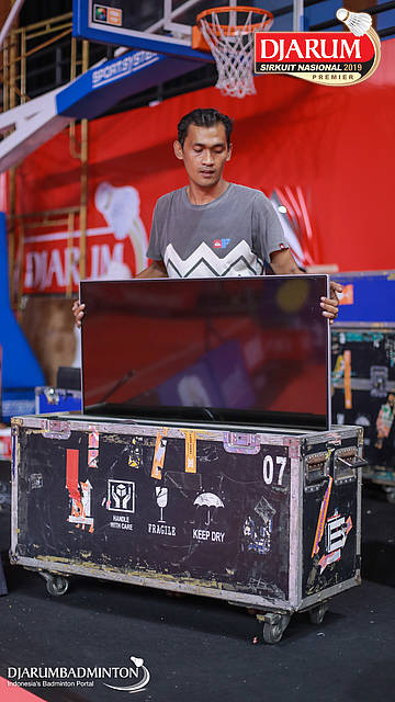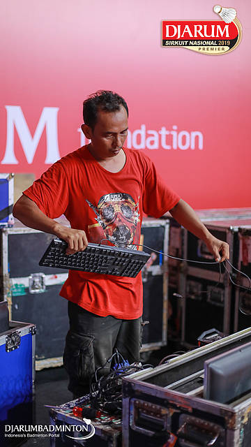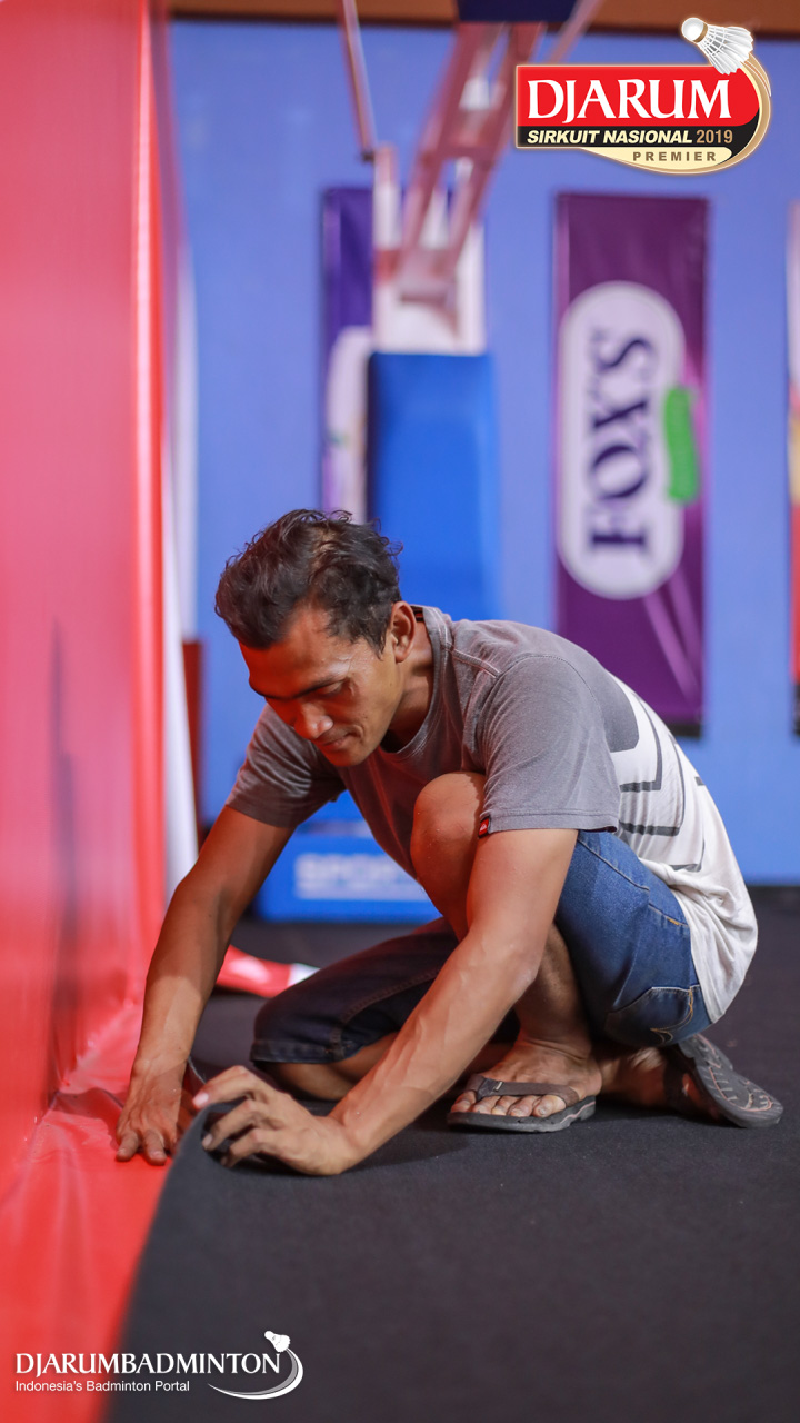 Salah satu pekerja sedang mengerjakan perlengkapan logistik Djarum Sirkuit Nasional Premier DKI Jakarta Open 2019