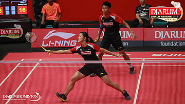 Dejan Ferdinansyah+Serena Kani (PB Djarum, Kudus) menggapai shuttlecock