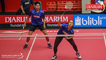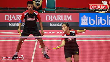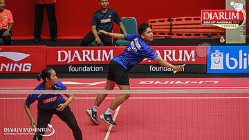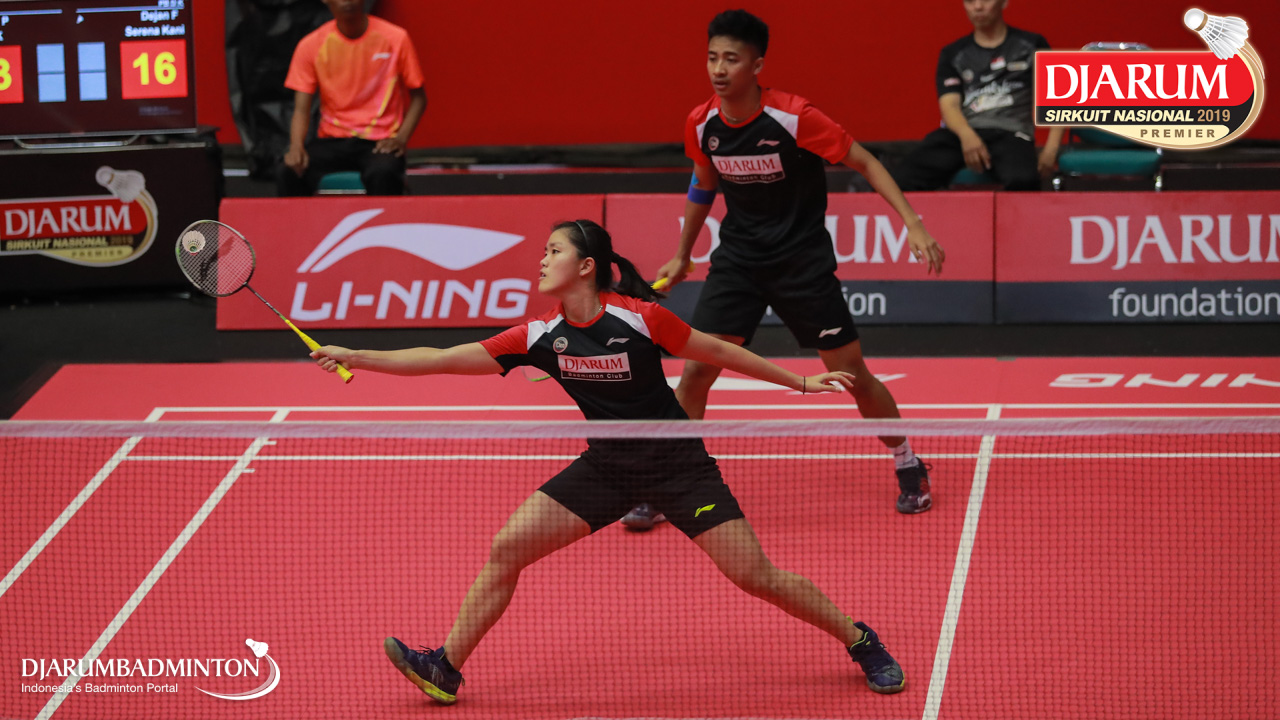 Dejan Ferdinansyah+Serena Kani (PB Djarum, Kudus) menyambut servis