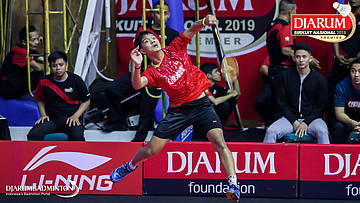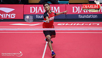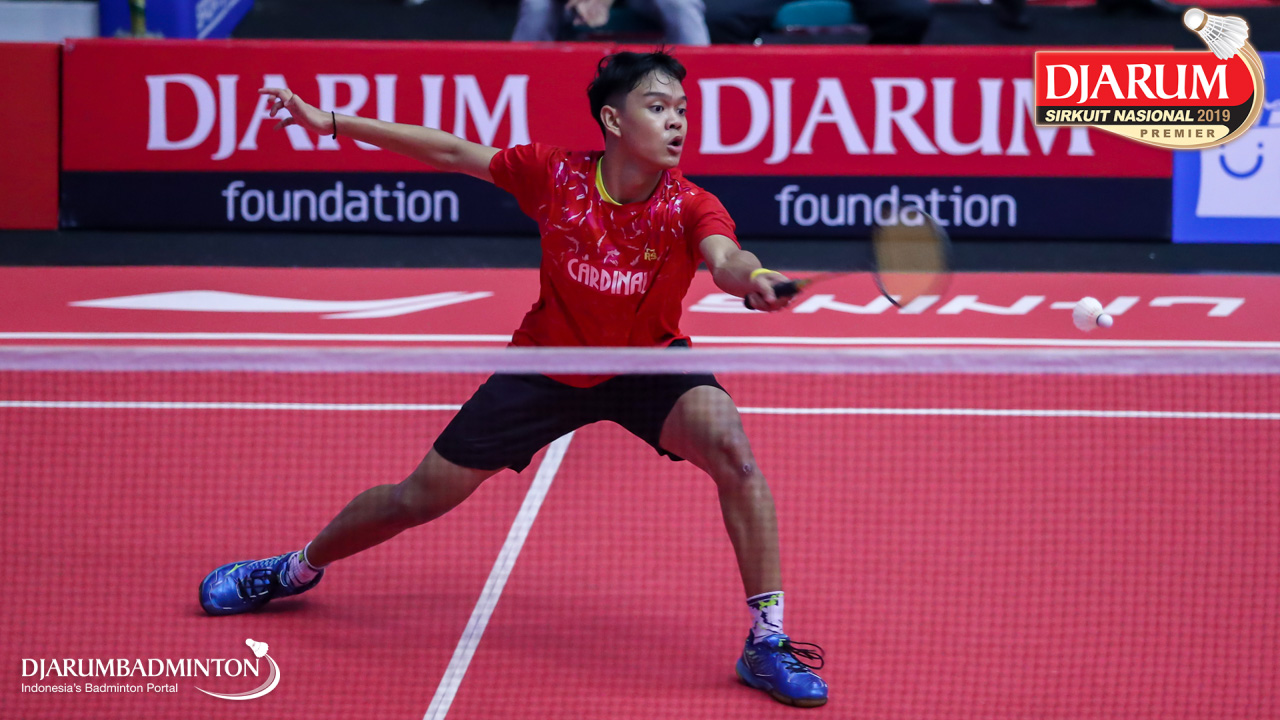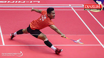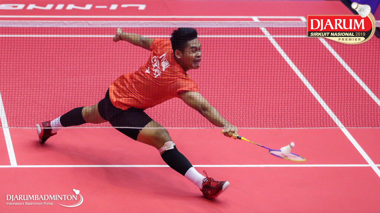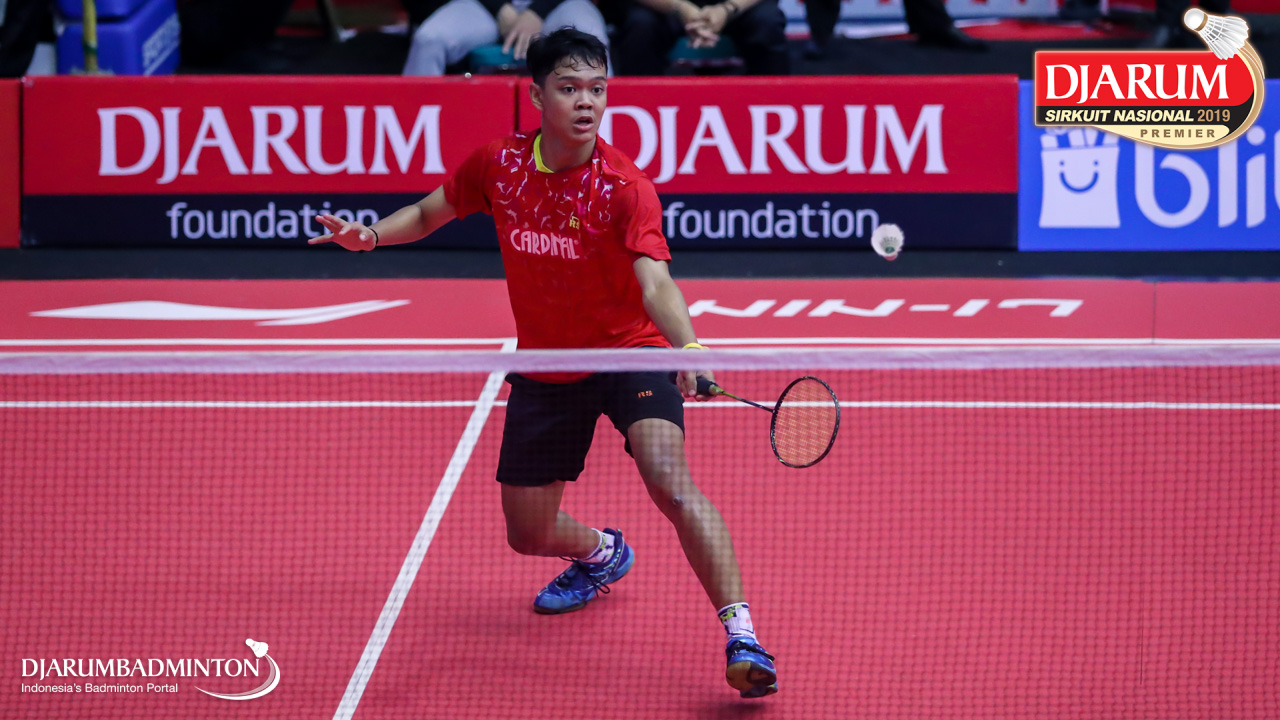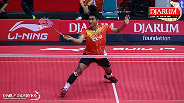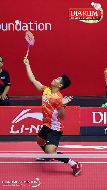 Muh. Asqar Harianto (PB Djarum, Kudus) menyambut shuttlecock