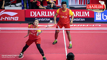 Ghana Muhammad Al Ilham+Khusnul Khatimah (PB Djarum, Kudus) mengembalikan serangan