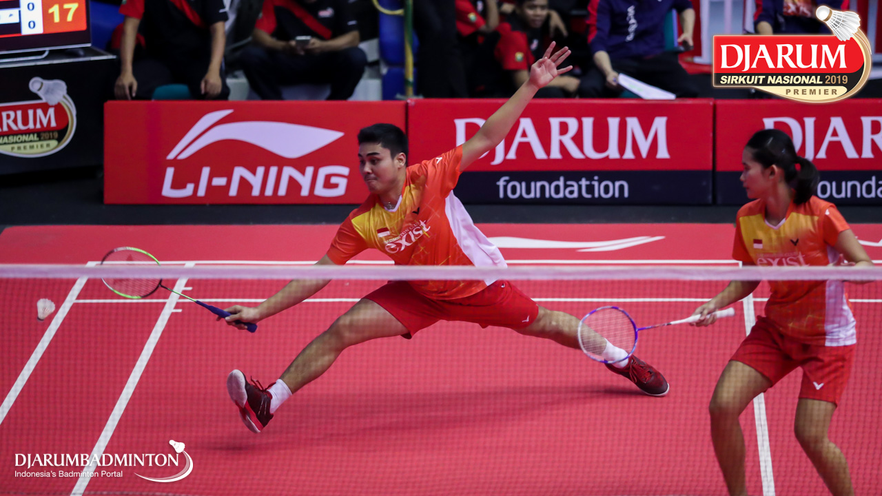 Muhammad Yusuf Maulana+Silvia Ratih (Exist Badminton Club) berusaha menggapai pengembalian