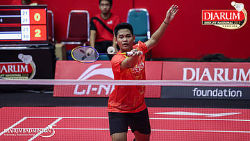 Muhammad Iqbal (Exist Badminton Club) melepaskan serangan