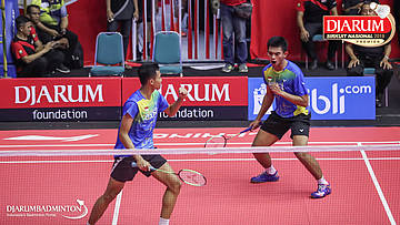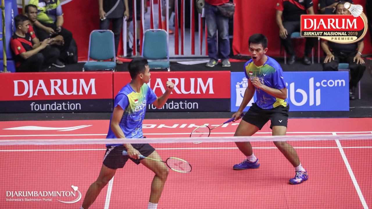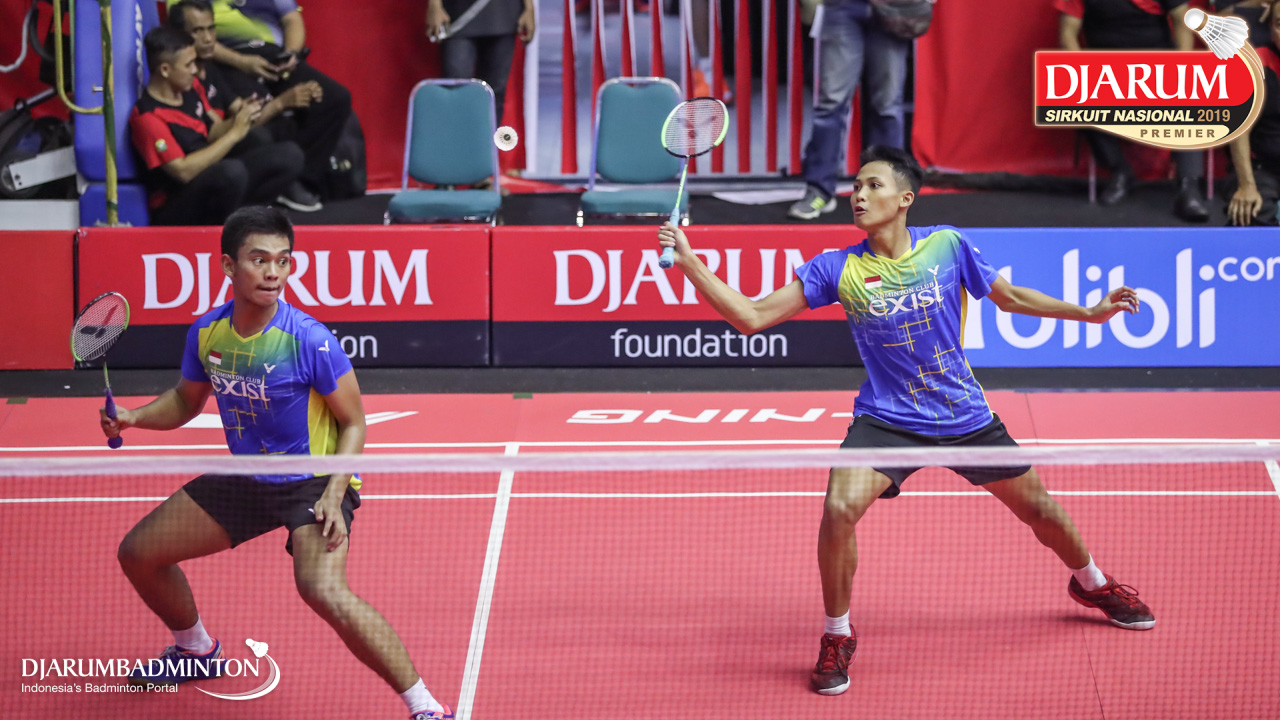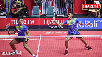 Gavy Anak Satriyadi+Muhammad Galih Rezka Ramadhan (Exist Badminton Club) bersiap menyambut pengembalian