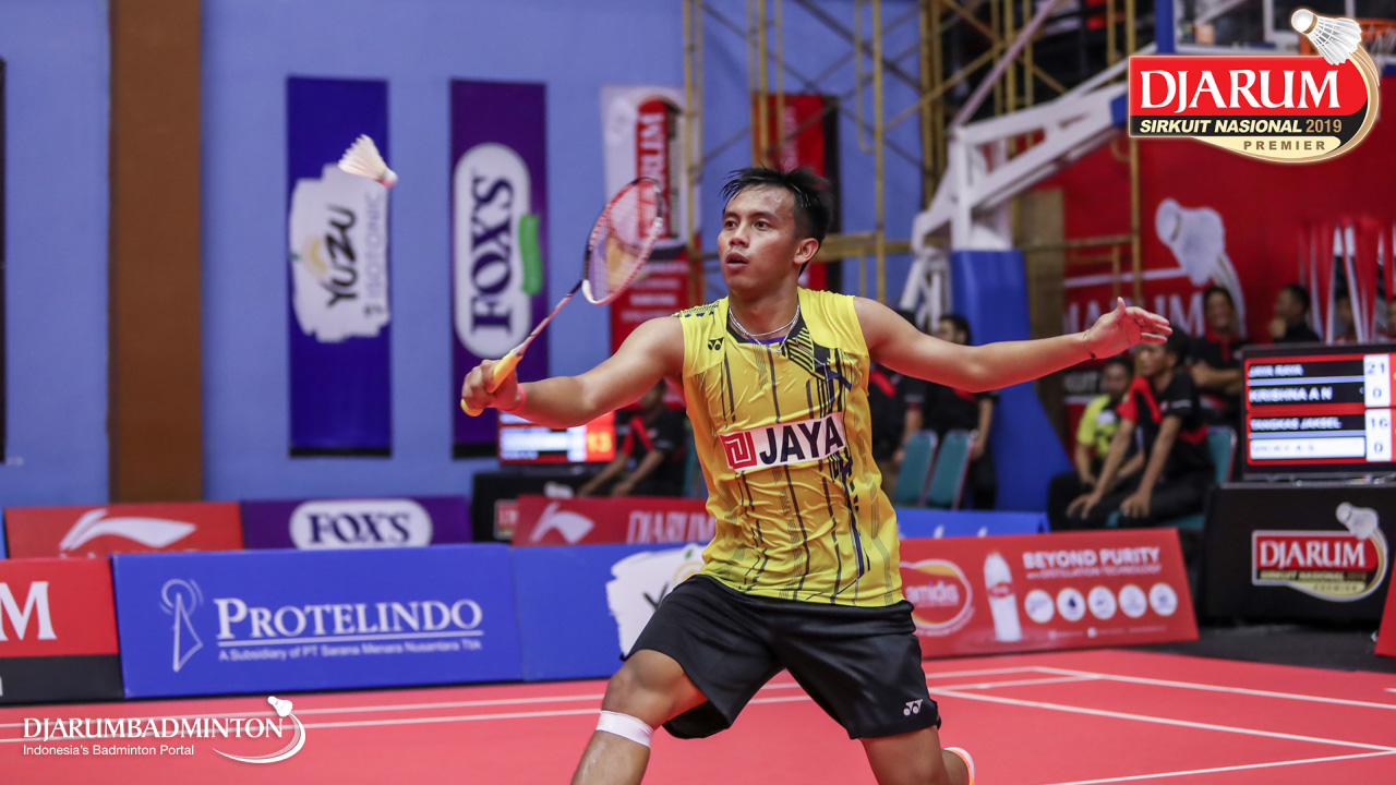 Krishna Adi Nugraha (Jaya Raya Jakarta) bersiap menyambut shuttlecock