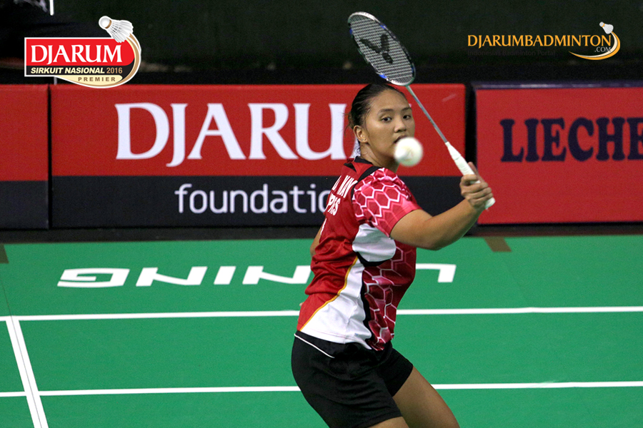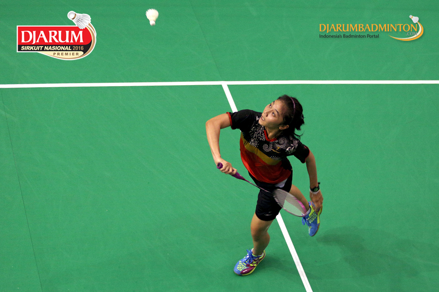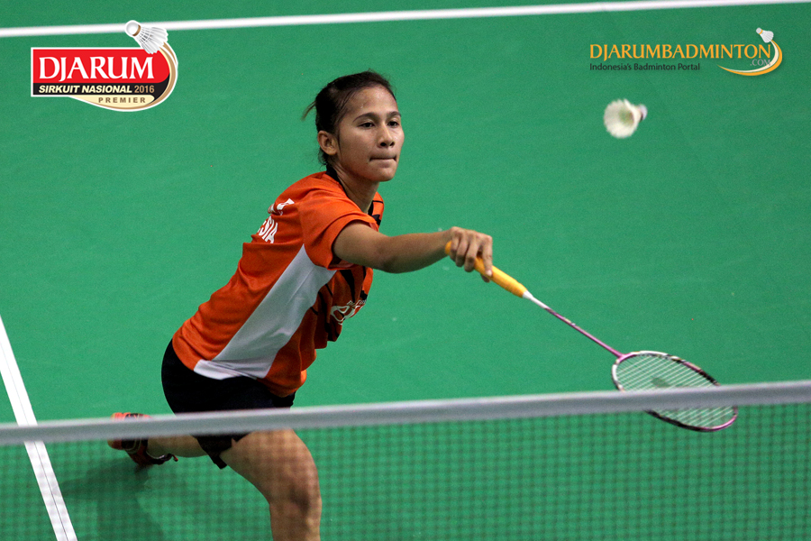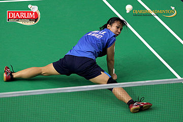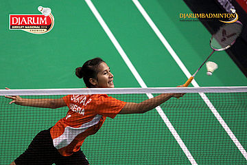 Aldira Rizki (Djarum Kudus) terjatuh saat berusaha menghadang serangan