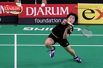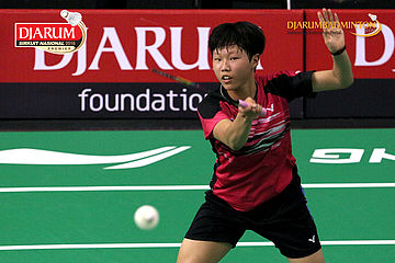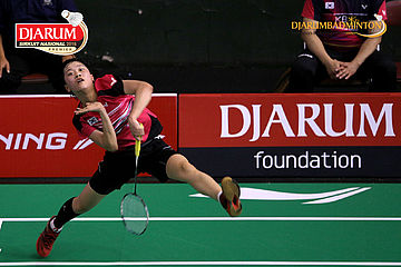 Ha Na Baek (Korea) mengembalikan shuttlecock