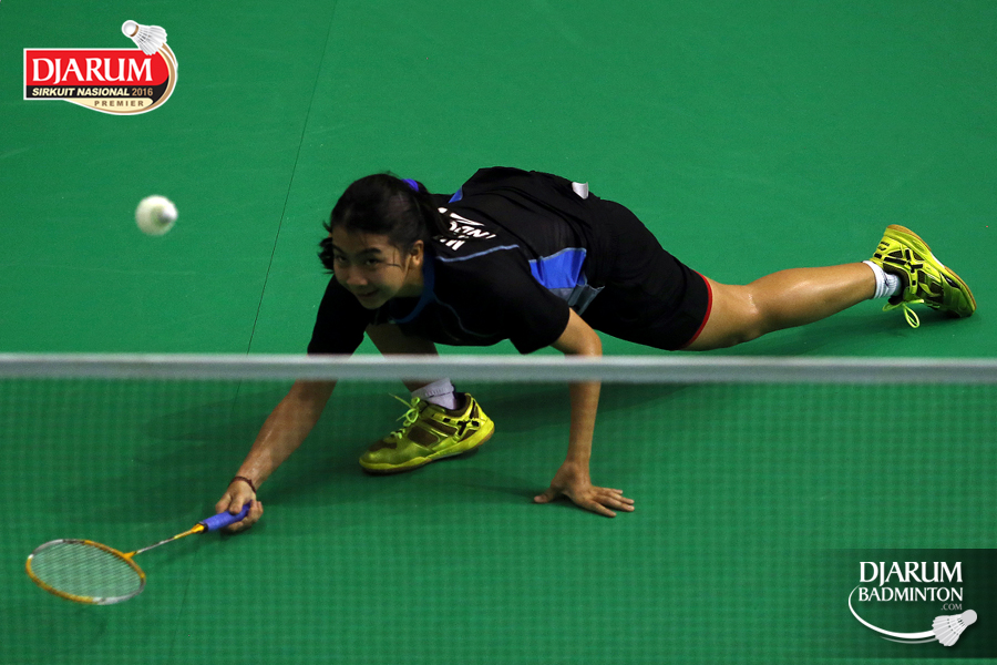 Ni Made Pranita (Batur) jatuh bangun mengembalikan shuttlecock