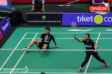 Ferdian Mahardika Ranialdy/Annisa Mubarokah (Jaya Raya Jakarta, Jakpus+Fifa BC Sidoarjo) terjatuh saat melakukan pengembalian