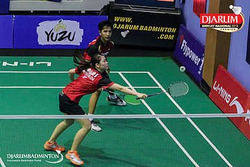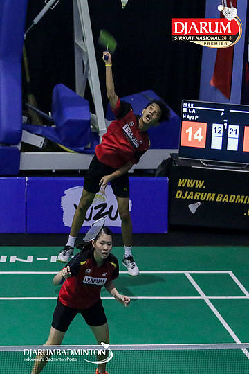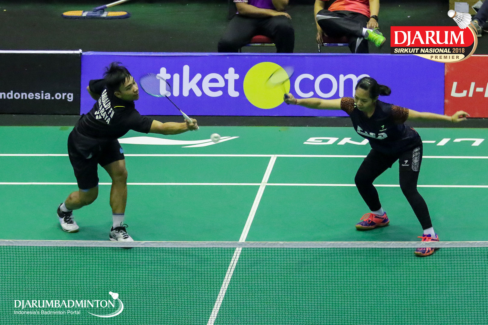 Ferdian Mahardika Ranialdy/Annisa Mubarokah (Jaya Raya Jakarta, Jakpus+Fifa BC Sidoarjo) berusaha mengembalikan shuttlecock