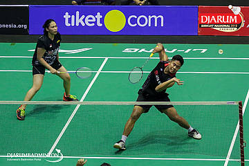M. Lucky Andres Apriyanda/Helena Ayu Puspitasari (PB Djarum, Kudus) mengembalikan serangan