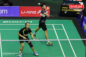 M. Lucky Andres Apriyanda/Helena Ayu Puspitasari (PB Djarum, Kudus) bersiap menyambut pengembalian