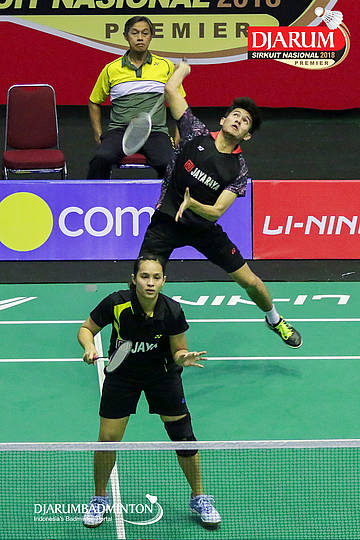 Adnan Maulana/Masita Mahmudin (Jaya Raya Jakarta, Jakpus) bersiap menyambut shuttlecock