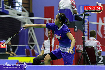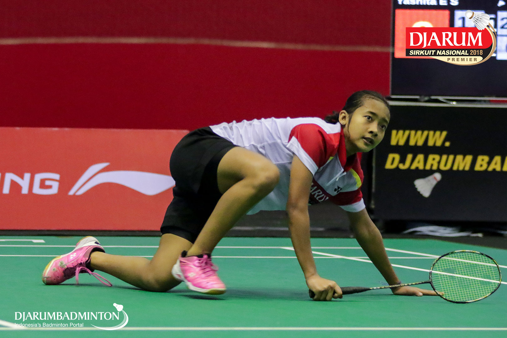 Desima Aqmar Syarafina (PB Djarum, Kudus) terjatuh saat berusaha mengembalikan serangan