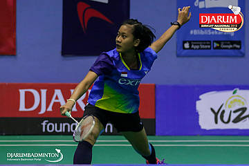 Putri Kusuma Wardani (Exist, Jakarta) mengembalikan shuttlecock