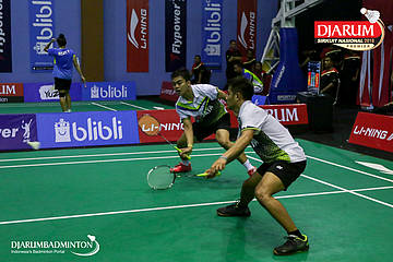 Amri Syahnawi/Rian Swastedian (Jaya Raya Jakarta, Jakpus) berusaha menyambut serangan