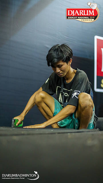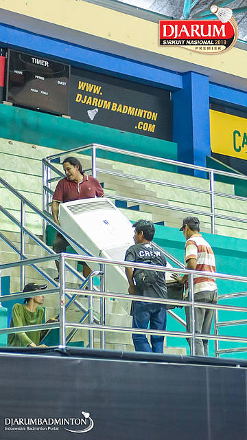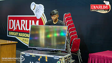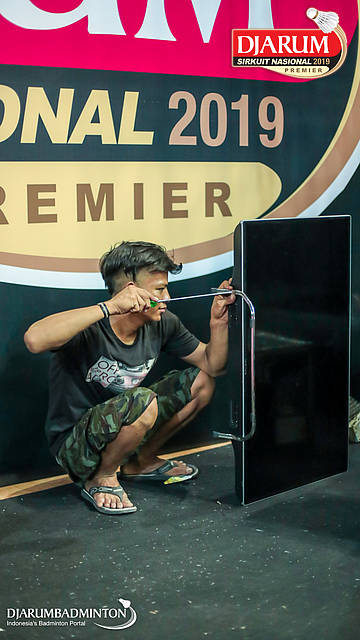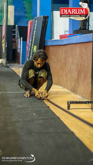 Salah satu pekerja sedang mengerjakan perlengkapan logistik Djarum Sirkuit Nasional Premier Li Ning Jawa Timur Open 2019