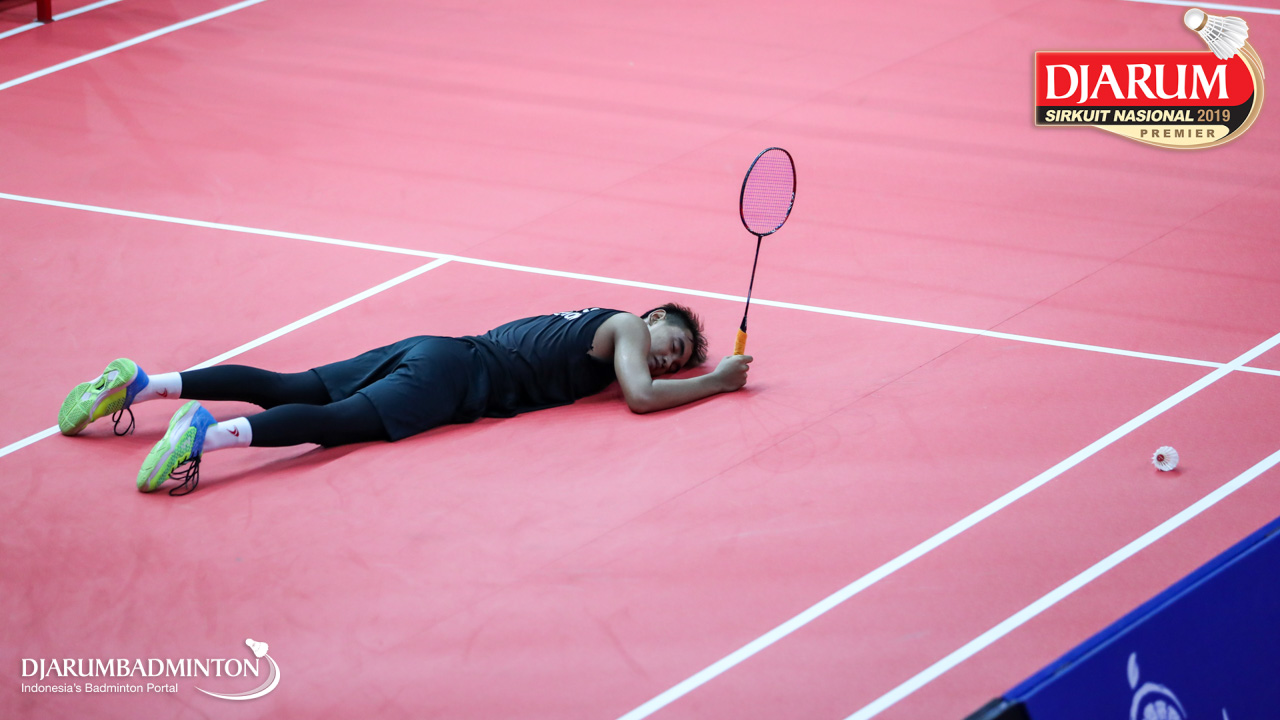 AARON SANGGA WIJAYA (Sakura Badminton, Sby) terjatuh saat berusaha menggapai pengembalian