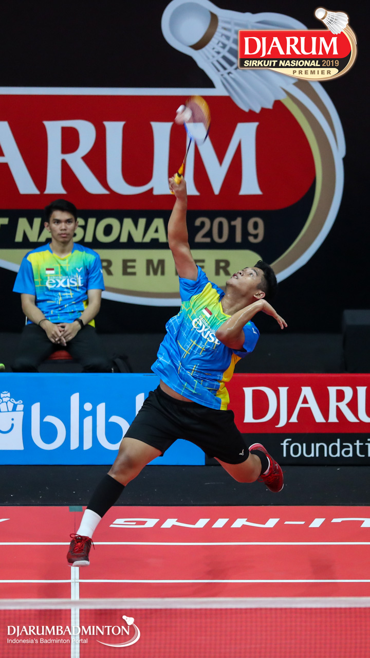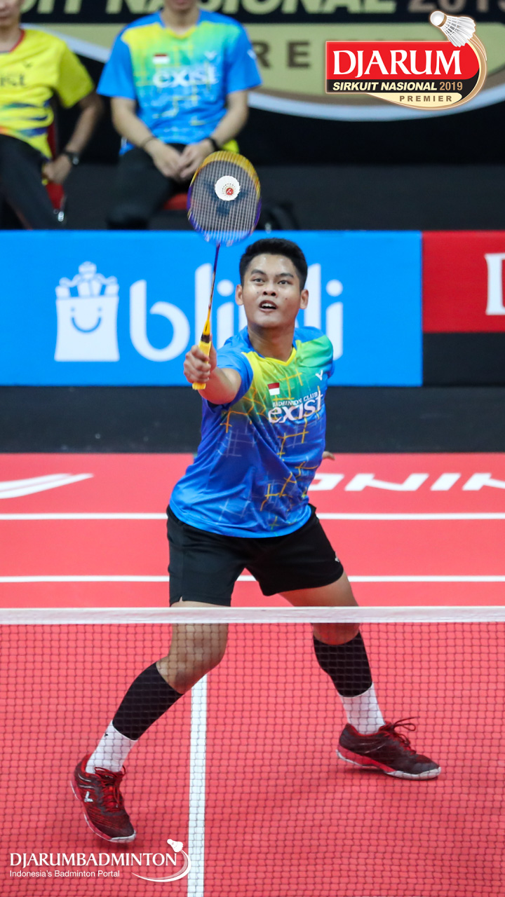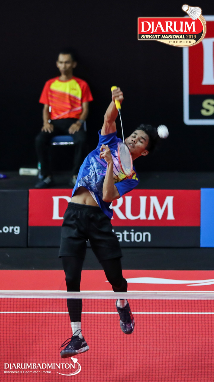 Muhammad Iqbal (Exist Badminton Club) menyambar shuttlecock