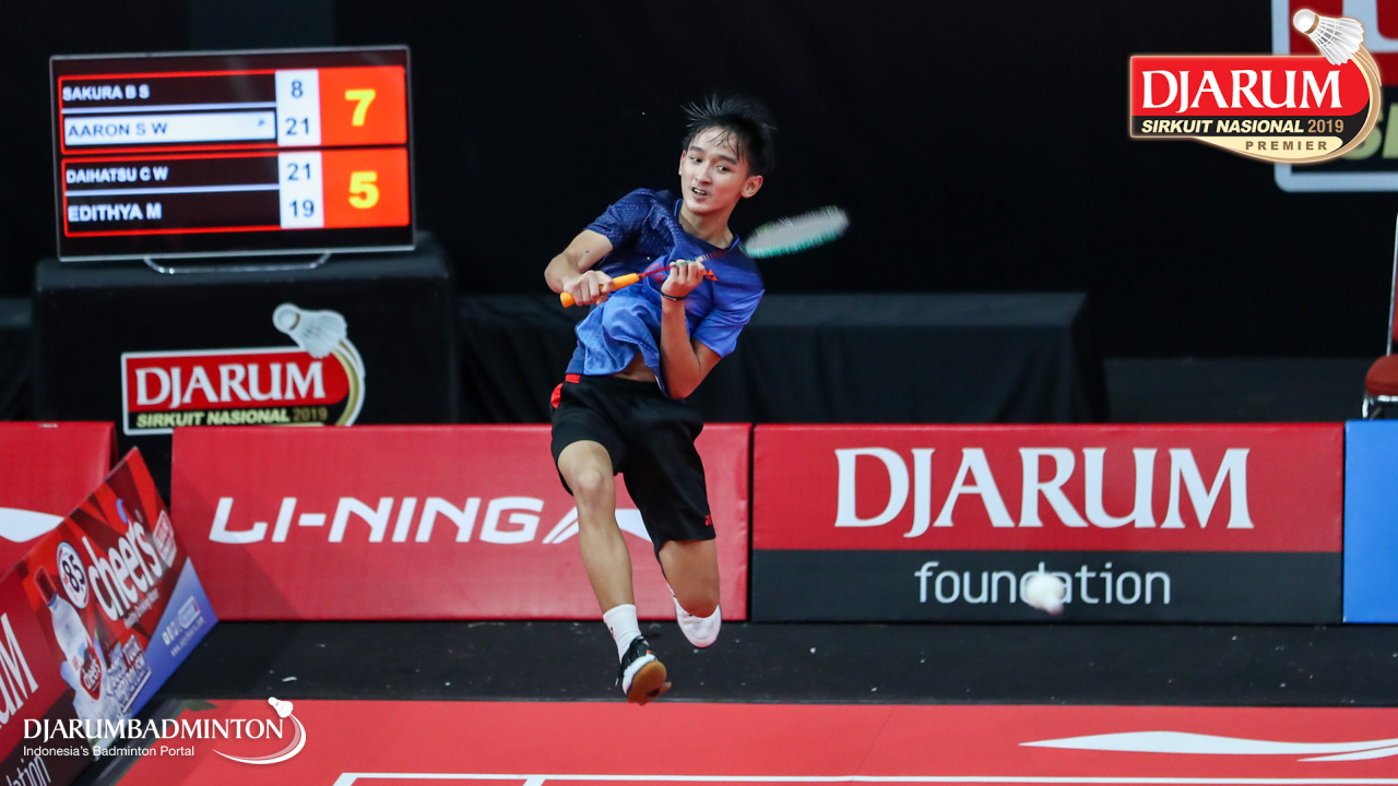 AARON SANGGA WIJAYA (Sakura Badminton, Sby) mengembalikan shuttlecock