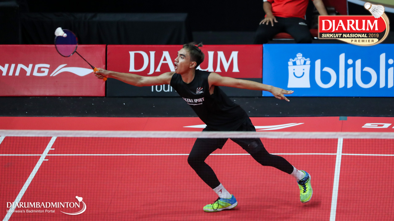AARON SANGGA WIJAYA (Sakura Badminton, Sby) menggapai serangan
