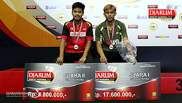 Runner Up, Syabda Perkasa Belawa (PB Djarum Kudus) Dan Juara Tunggal Dewasa Putra, Krishna Adi Nugraha (Jaya Raya Jakarta) Berfoto Di Podium