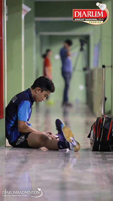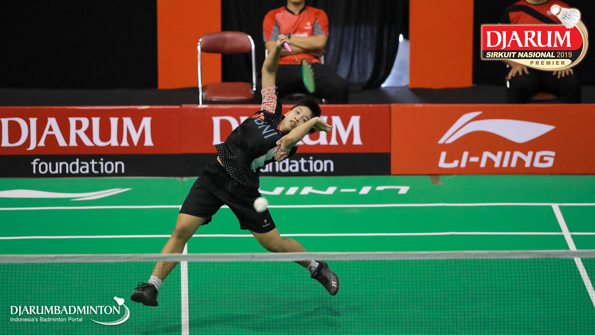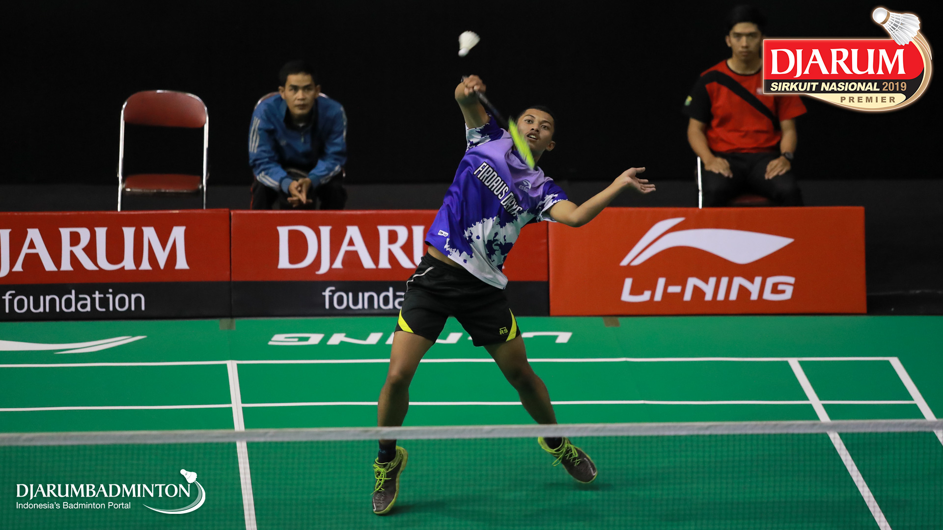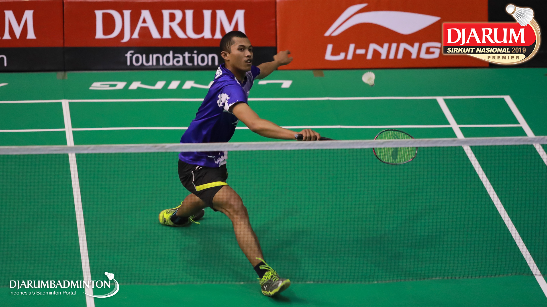 Agung Nugraha Assyifa Sugiarto (Victory, Bandung) bersiap menyambut shuttlecock