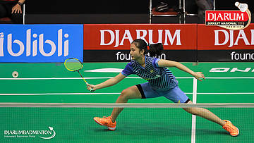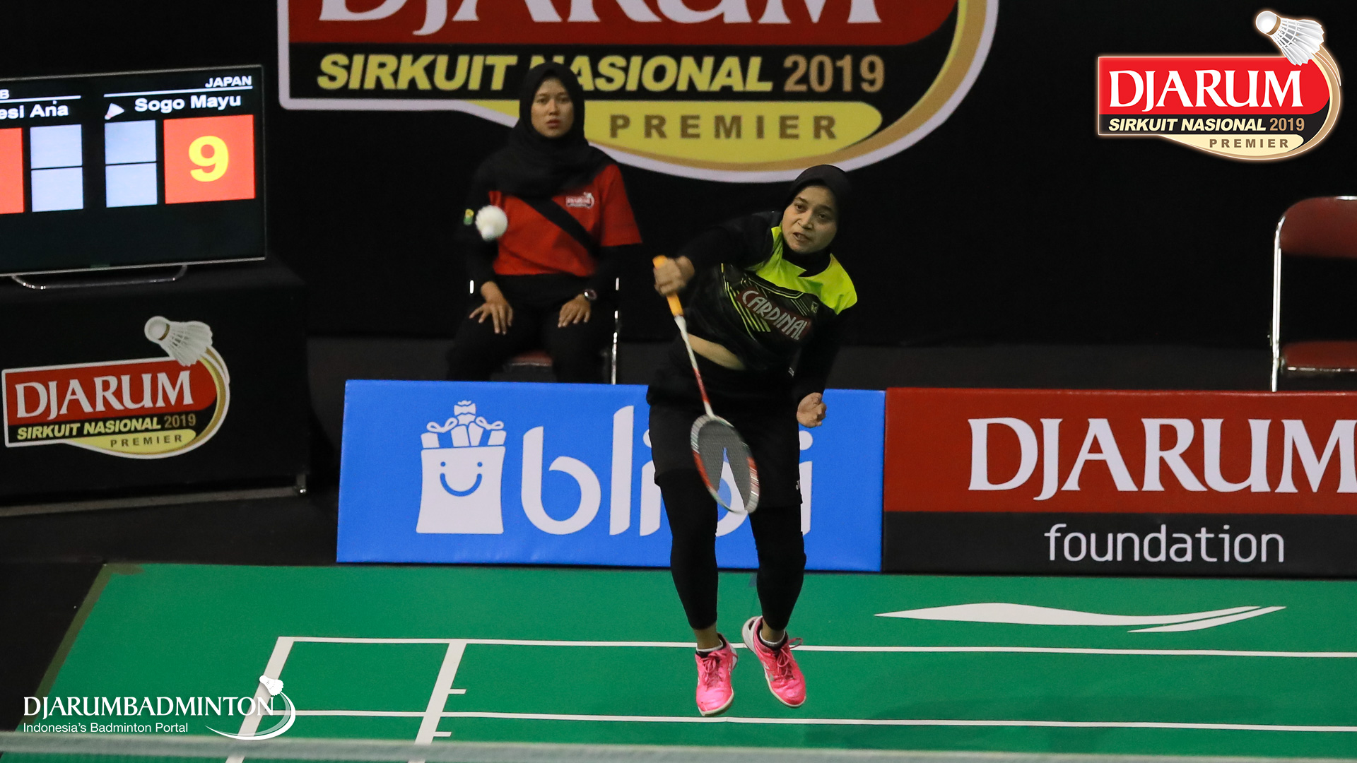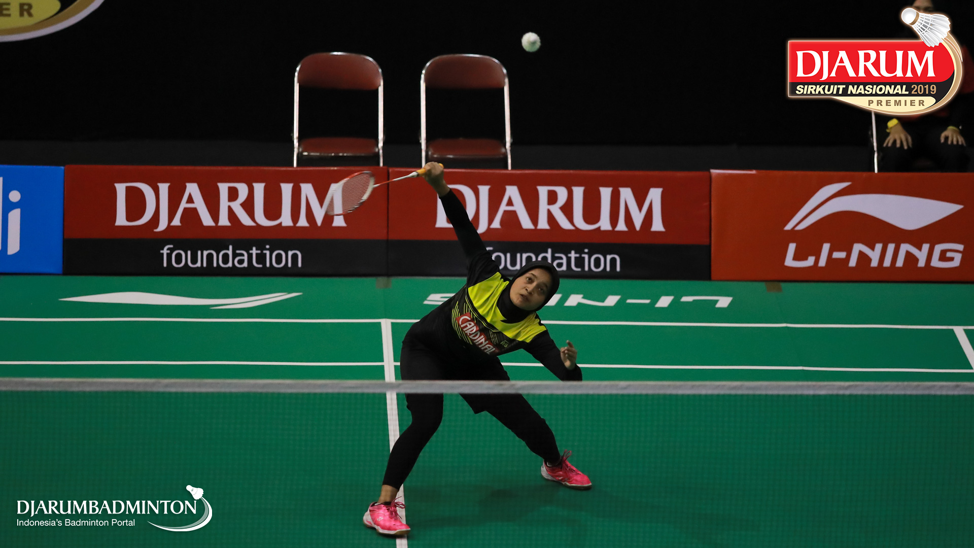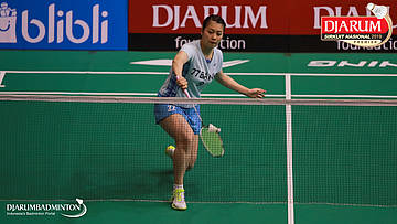 Elisabeth Purwaningtyas (Sangkuriang Graha Sarana PLN Bandung) bersiap menyambut shuttlecock