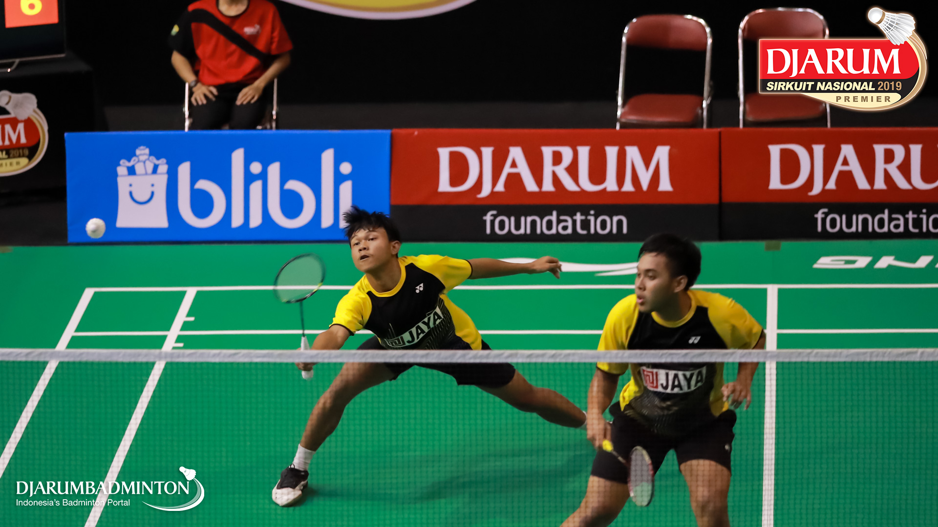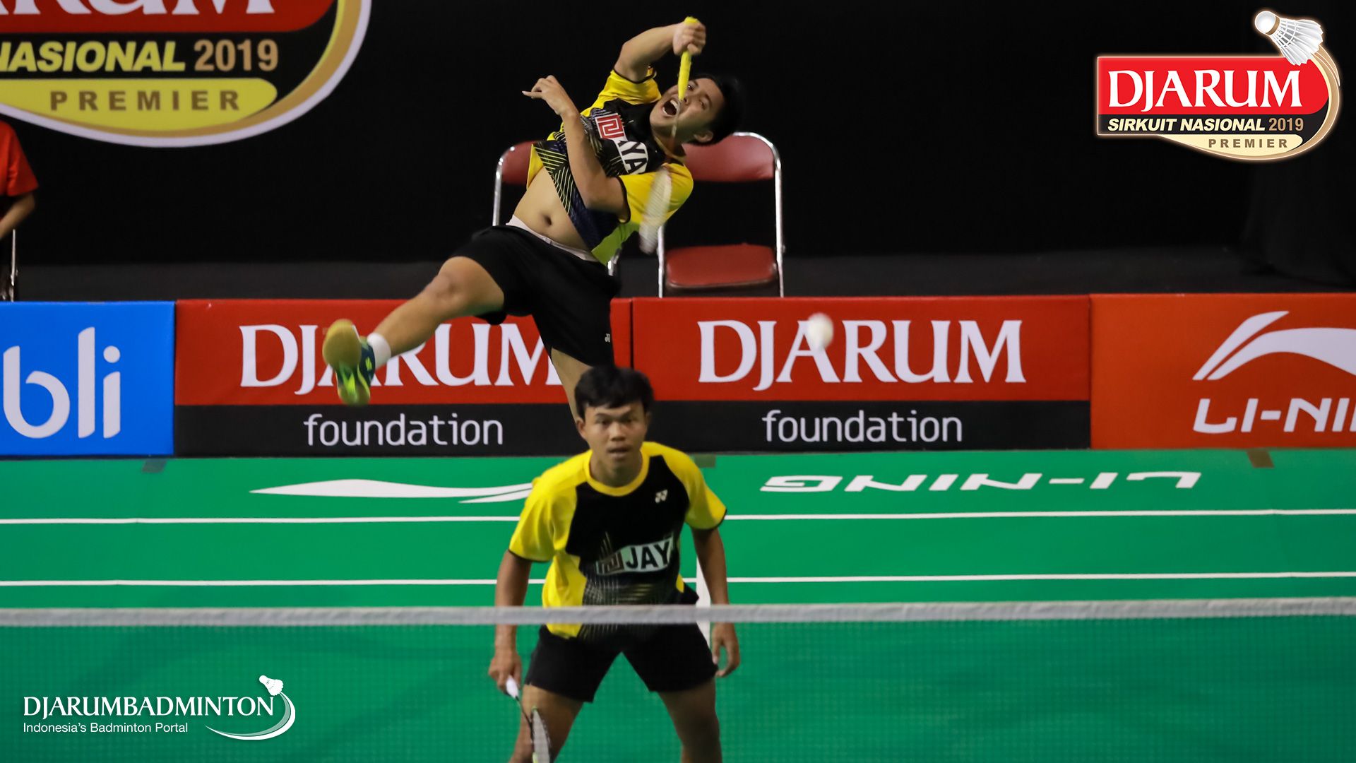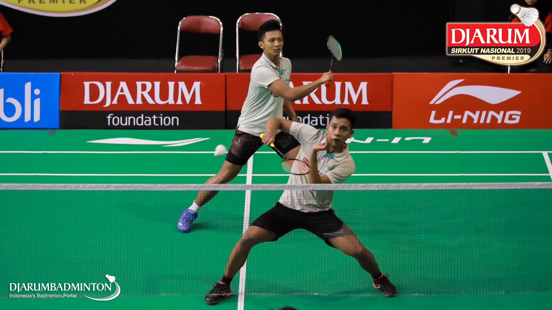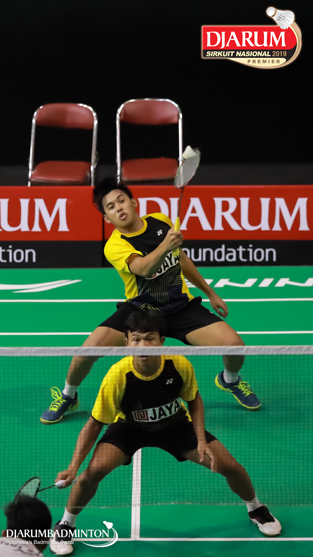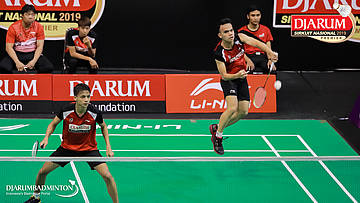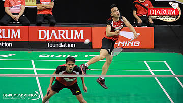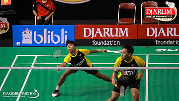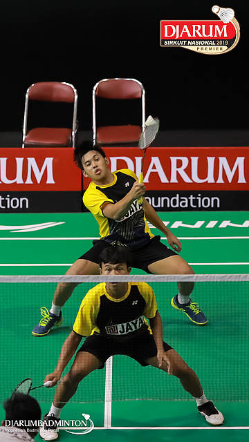 Asghar Herfanda+Rian Canna Varo (PB Djarum, Kudus) menyambar pengembalian