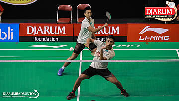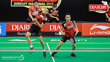 Alif Atallah Juan Setiawan+Teges Satriaji Cahyo Hutomo (Jaya Raya Jakarta) mengembalikan shuttlecock
