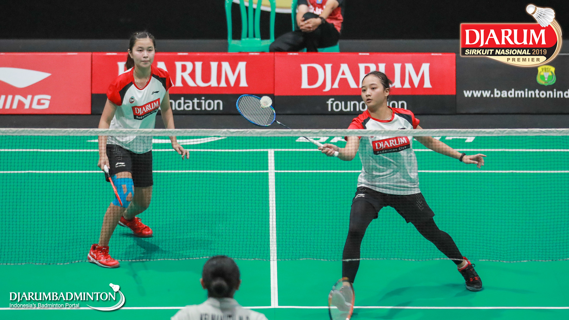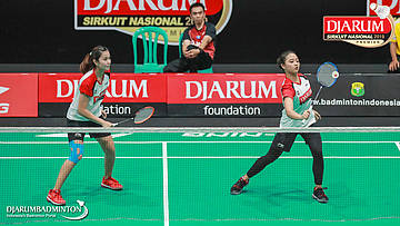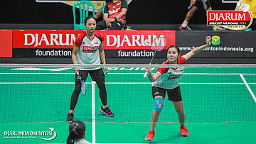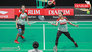 Salli Lin+Sintia Dewi Yuliani (PB Djarum, Kudus) menyambut shuttlecock