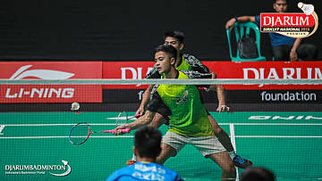 Alfa Rizki Fadlika+Andre Langgeng Pangestu (Jaya Raya Jakarta) berusaha mengembalikan shuttlecock