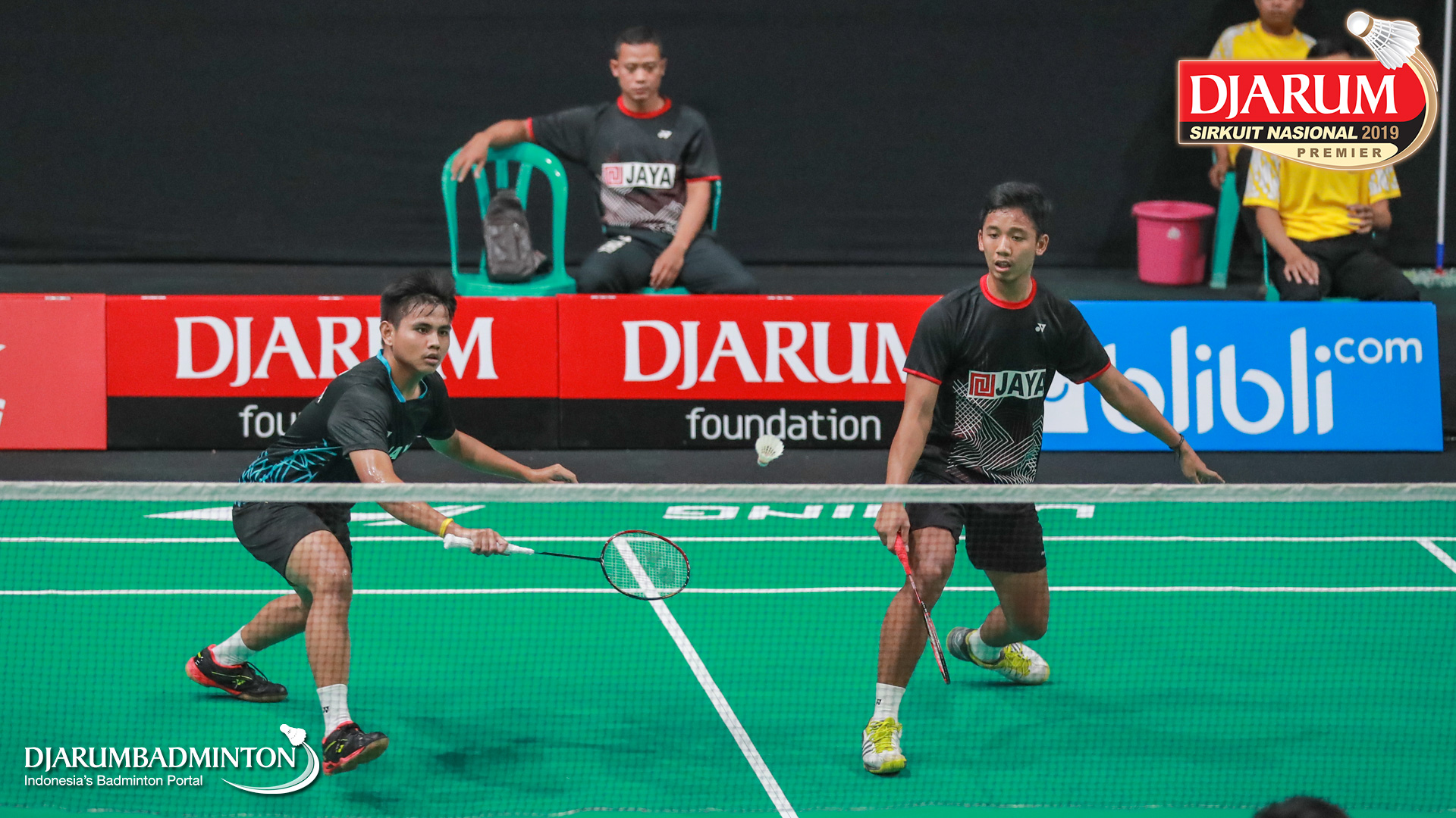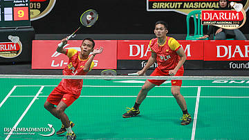 Alfa Rizki Fadlika+Andre Langgeng Pangestu (Jaya Raya Jakarta) bersiap menyambut shuttlecock