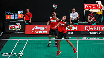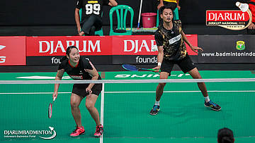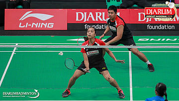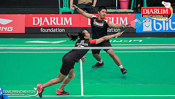 Yantoni Edy Saputra+Rosyita Eka Putri Sari (PB Djarum, Kudus) menyambut shuttlecock