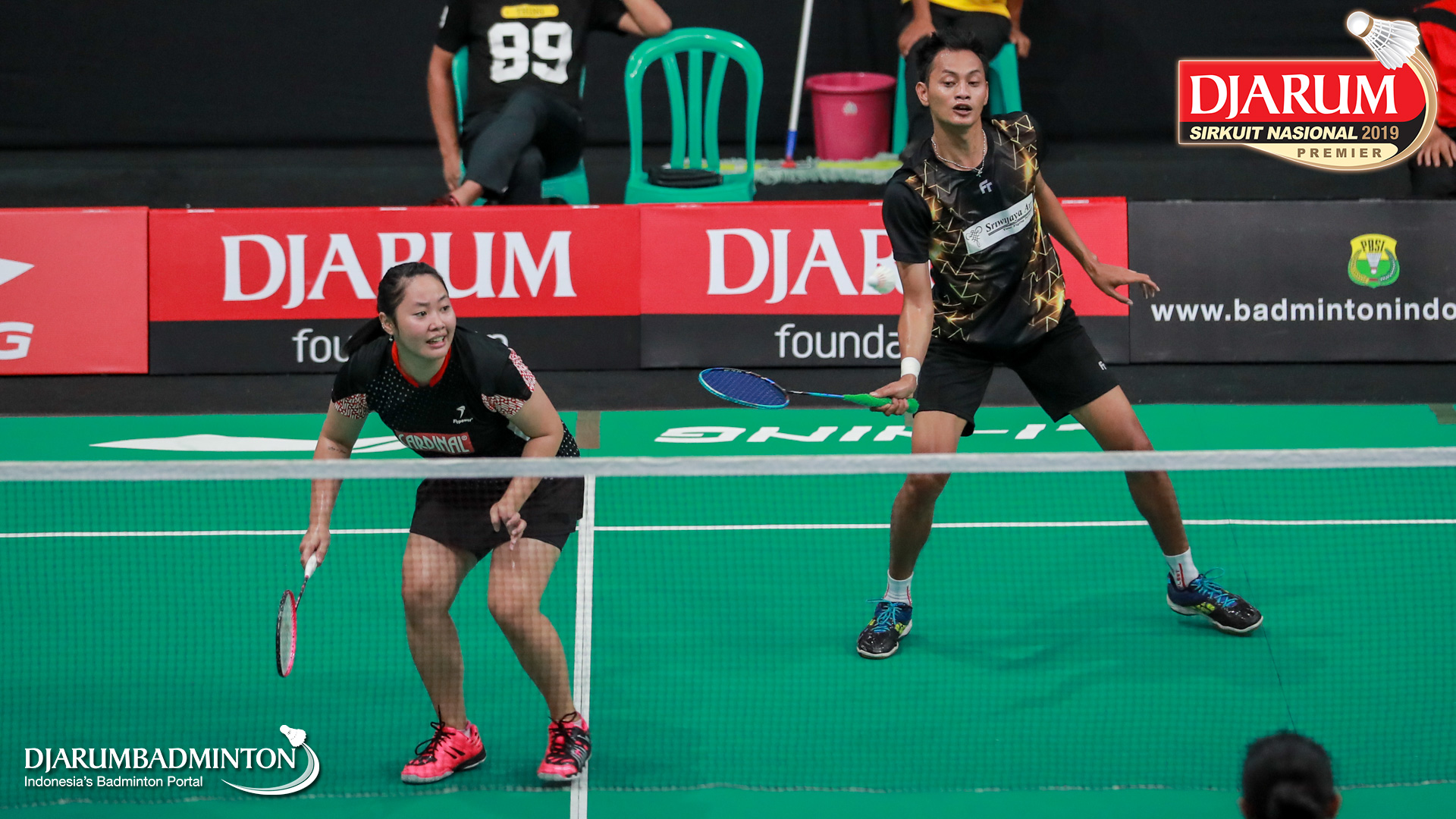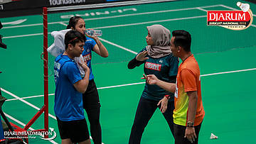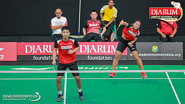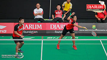 Calvin Kristanto+Ayu Gary Luna Maharani (PB Djarum, Kudus) menyambut shuttlecock