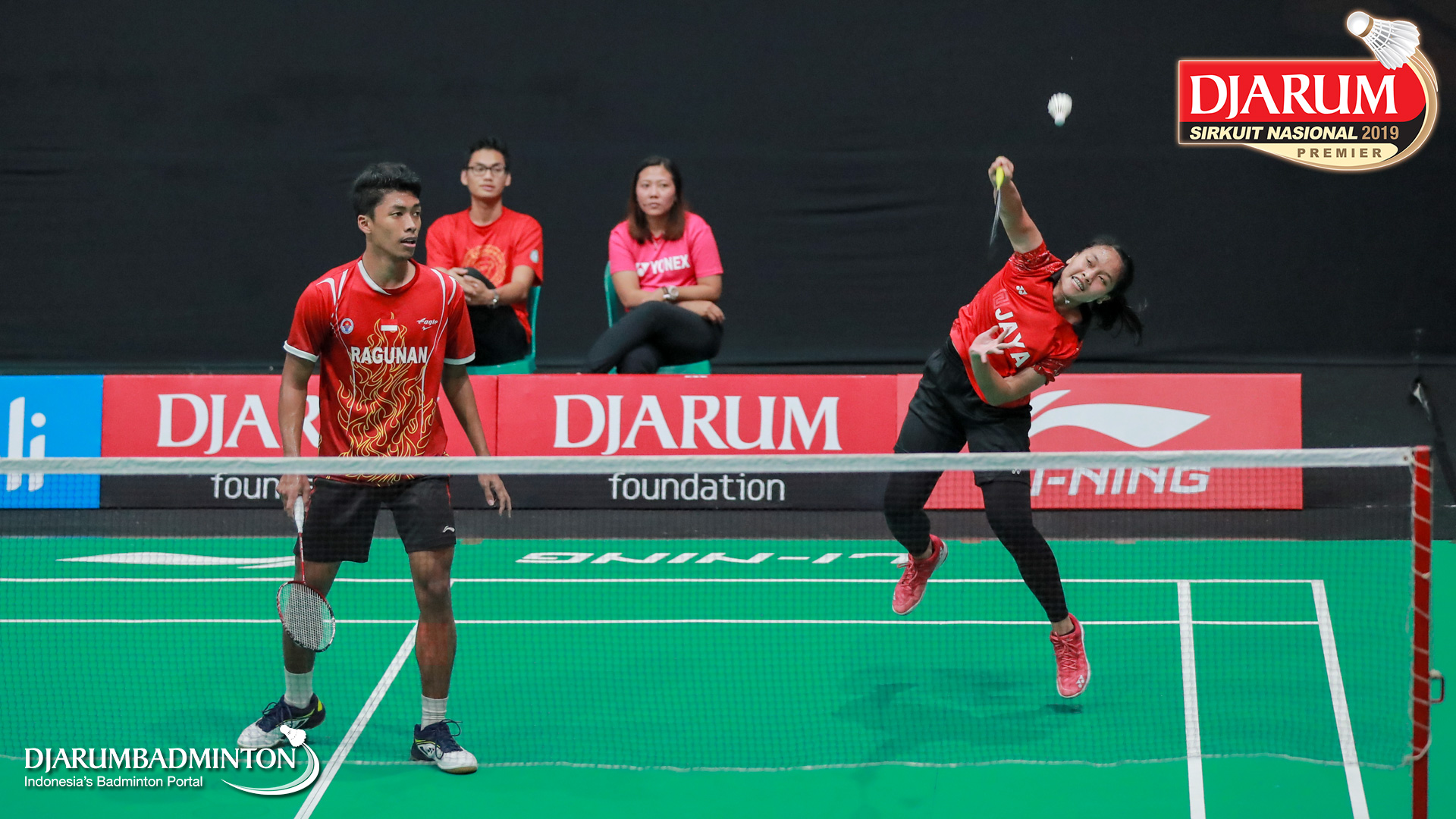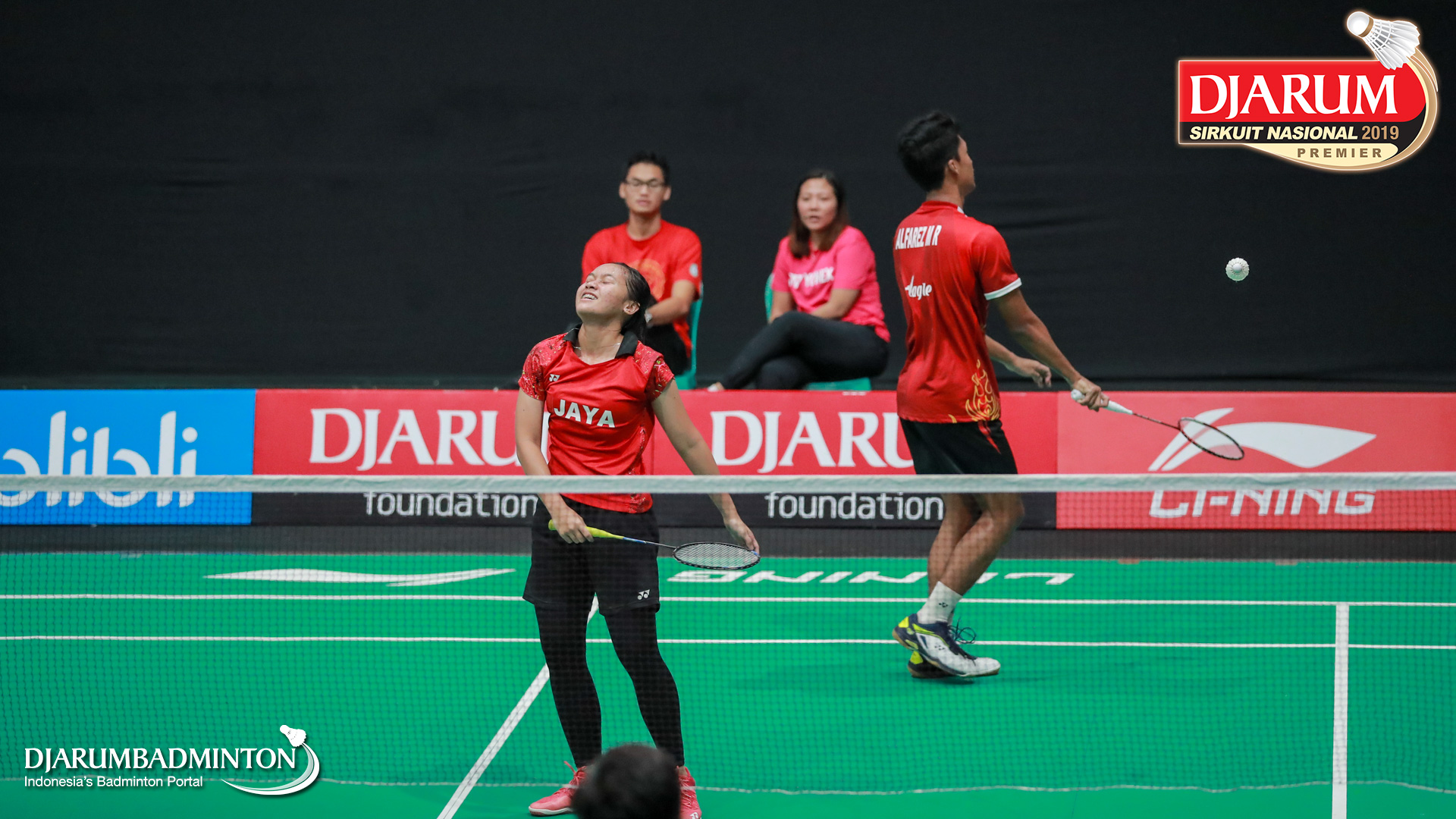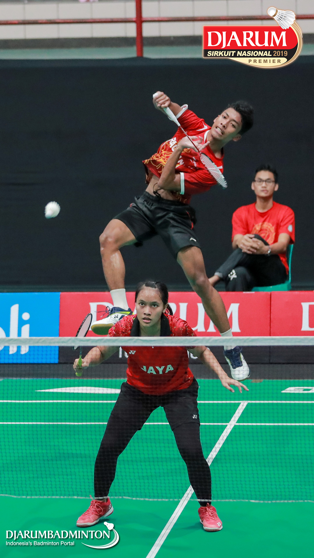 Moh Rezky Alfarez+Denisa Dwi Syawaliah Budiani (Sekolah Khusus Olahraga Ragunan+Jaya Raya Jakarta) melepaskan serangan