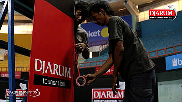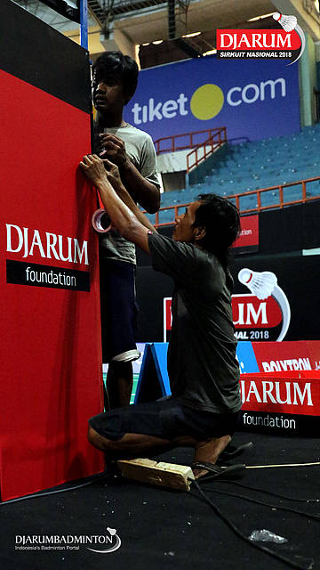 Dua orang pekerja sedang mengerjakan perlengkapan logistik Djarum Sirkuit Nasional Sulawesi Selatan Open 2018