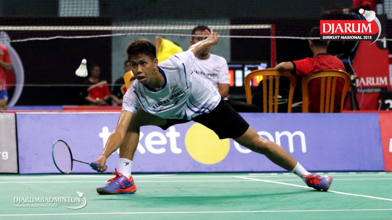 Aldo Oktaviano Purnomo (Sakura Badminton) mengembalikan shuttlecock