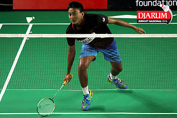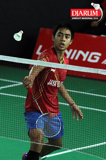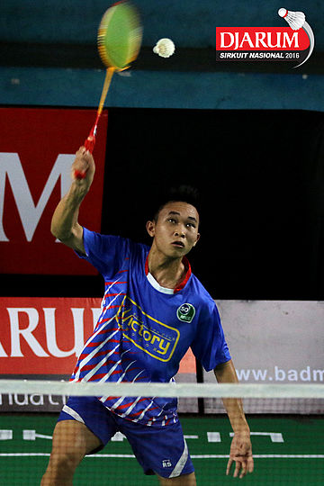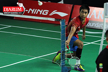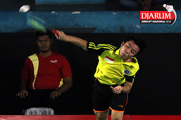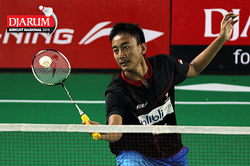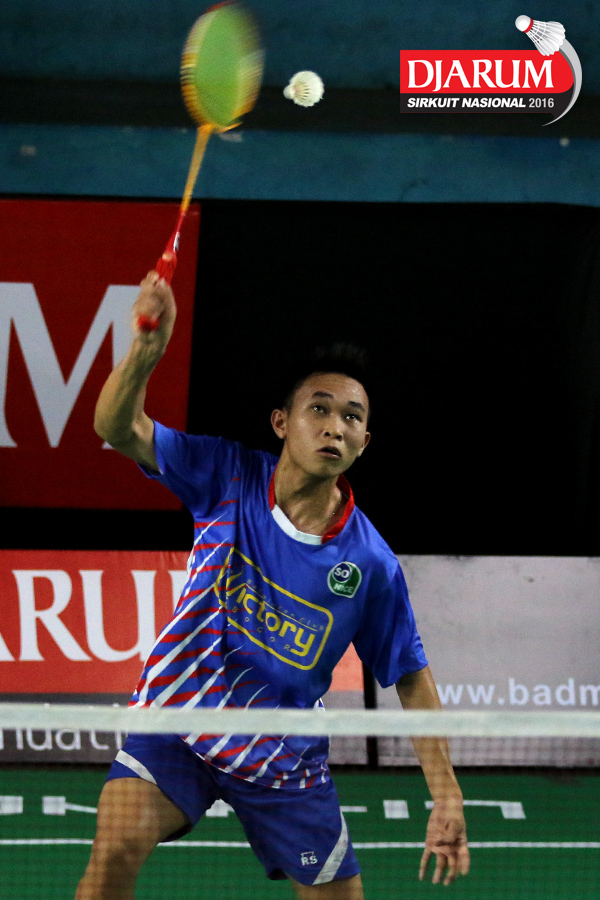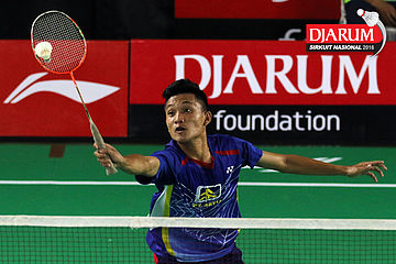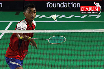 Vero Wisnu (Djarum Kudus) mengembalikan shuttlecock.