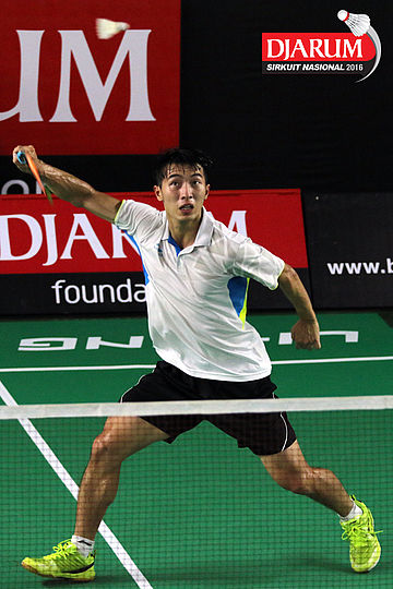 Sheng Xiao Dong (Tiongkok) mengembalikan shuttlecock.