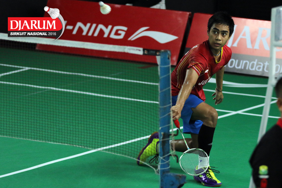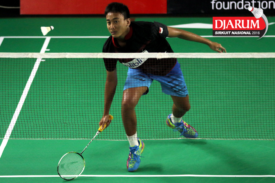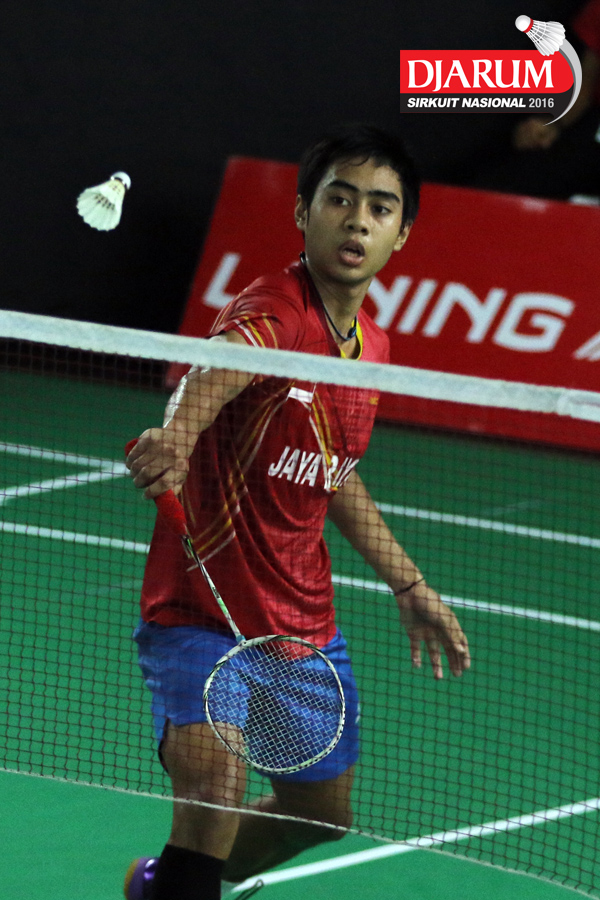 Andi Fadel (Jaya Raya) mengembalikan shuttlecock.