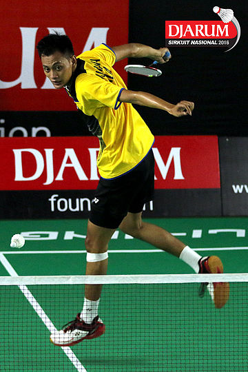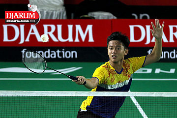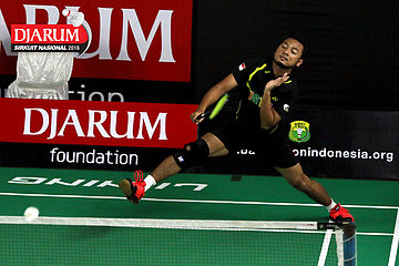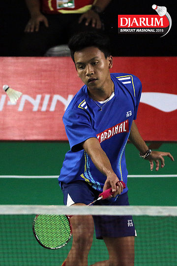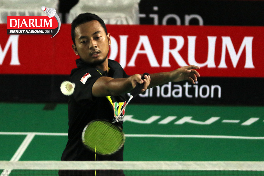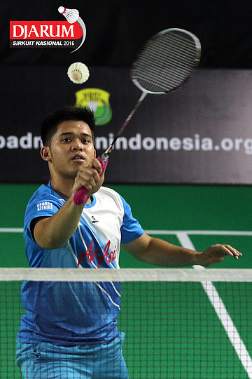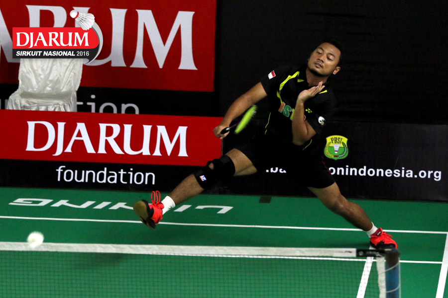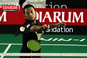 M. Luthfi Erlangga (Mutiara Cardinal) mengembalikan shuttlecock.