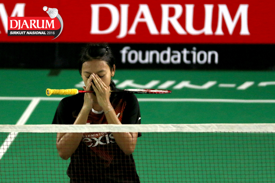 Ekspresi Bening Sri Rahayu (Exist) saat berhasil memenangkan pertandingan.