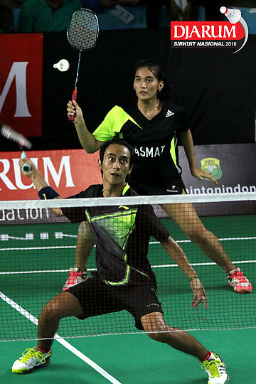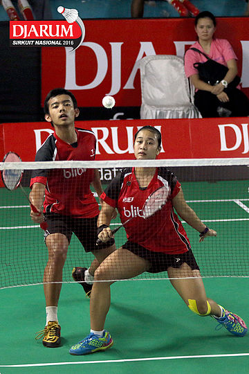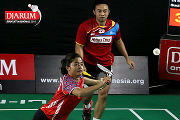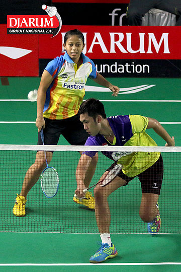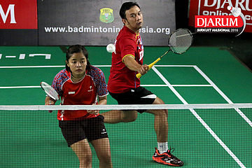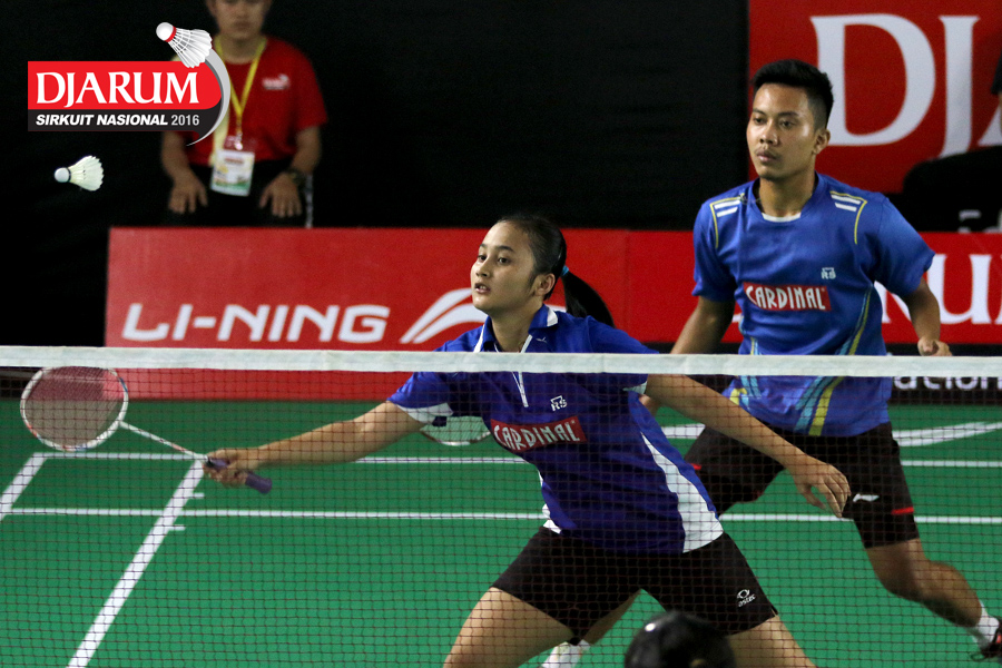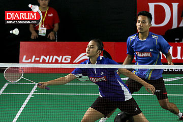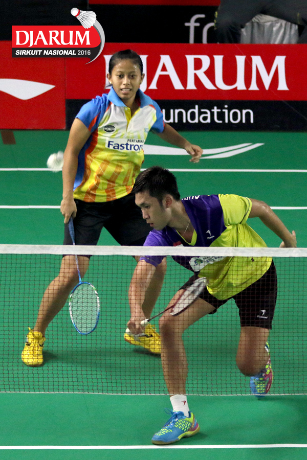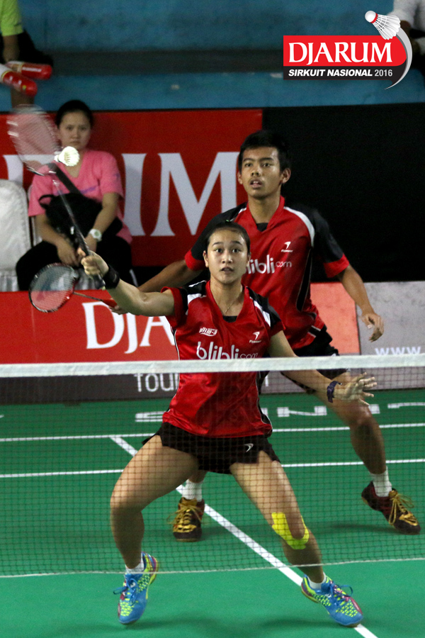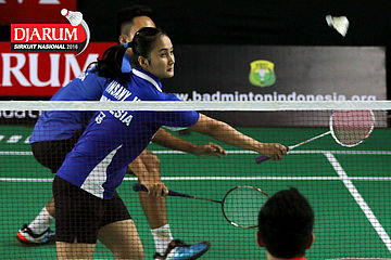 Pramudya Kusumawardana/Lisa Ayu (Djarum Kudus) mengembalikan shuttlecock.