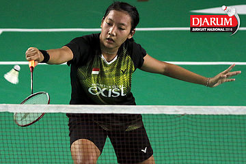 Bening Sri Rahayu (Exist) mengembalikan shuttlecock.